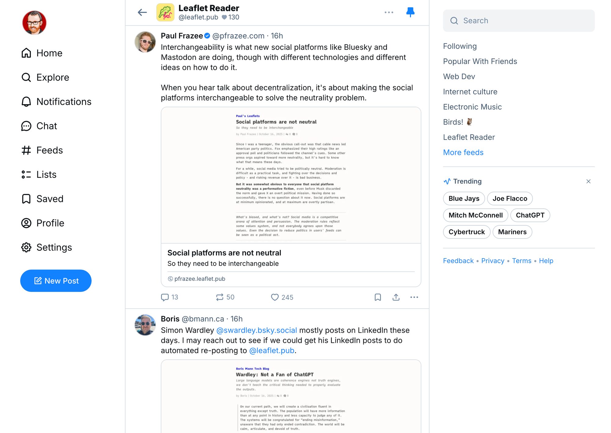 🦋 Leaflet, the blogging product running on AT Protocol, has a new Discover page showing off all the people using it. Accordingly, I subscribed to a bunch of leaflets; the process is a little confusing at first, but once you realize that you get a custom Bluesky feed of the sites you subscribe to (labelled "Leaflet Reader"), it makes sense! You can also read your feeds in Leaflet's product.